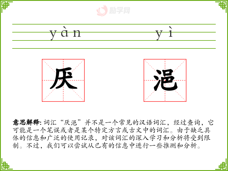 词汇“厌浥”并不是一个常见的汉语词汇,经过查询,它可能是一个笔误或者是某个特定方言或古文中的词汇。由于缺乏具体的信息和广泛的使用记录,对该词汇的深入学习和分析将受到限制。不过,我们可以尝试从已有的信息中进行一些推测和分析。