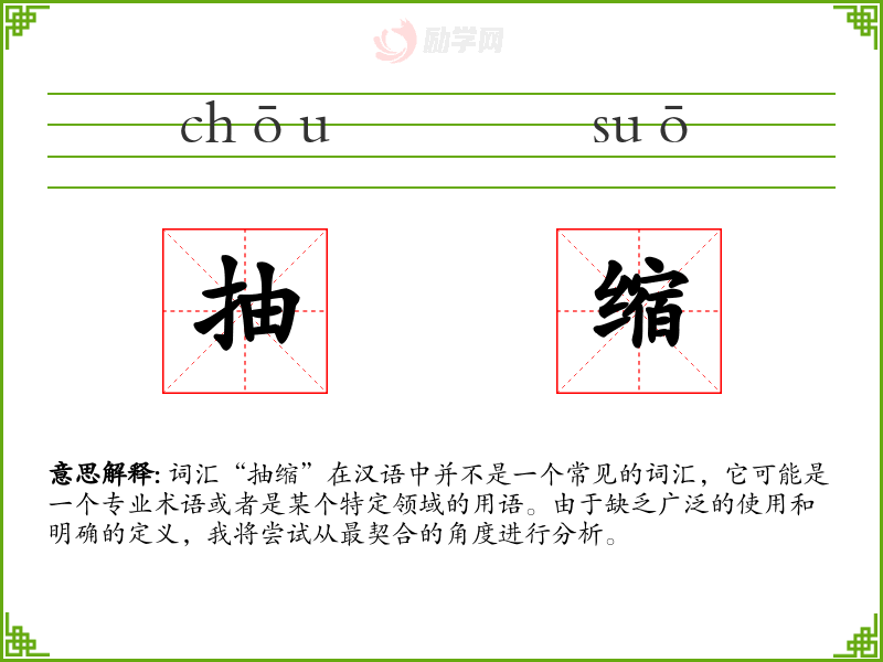 词汇“抽缩”在汉语中并不是一个常见的词汇,它可能是一个专业术语或者是某个特定领域的用语。由于缺乏广泛的使用和明确的定义,我将尝试从最契合的角度进行分析。