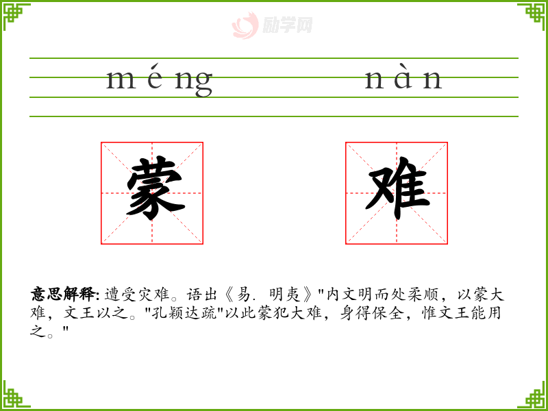 蒙难的意思是:遭受灾难。语出《易.明夷》"内文明而处柔顺,以蒙大难,文王以之。"孔颖达疏"以此蒙犯大难,身得保全,惟文王能用之。"