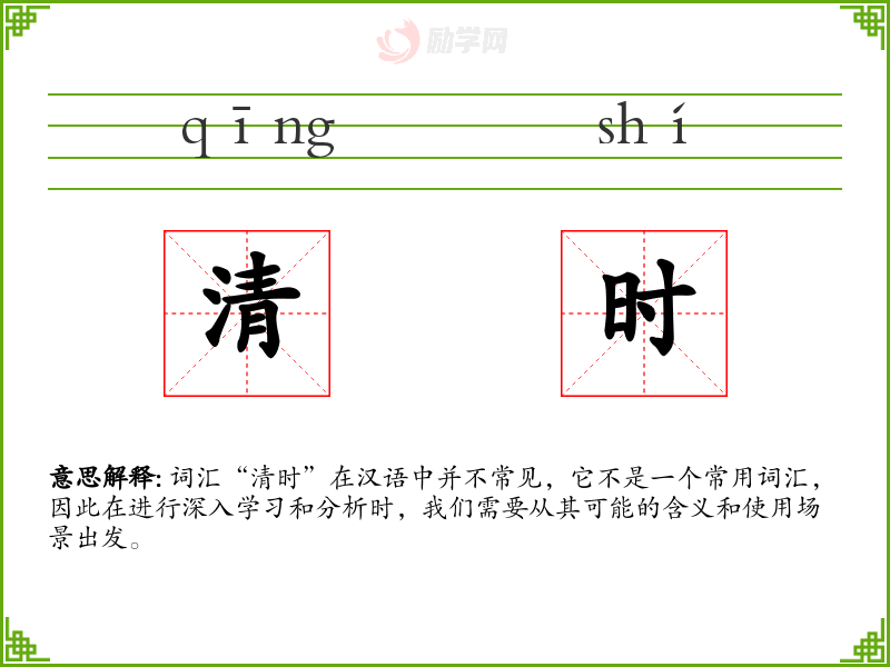 词汇“清时”在汉语中并不常见,它不是一个常用词汇,因此在进行深入学*和分析时,我们需要从其可能的含义和使用场景出发。