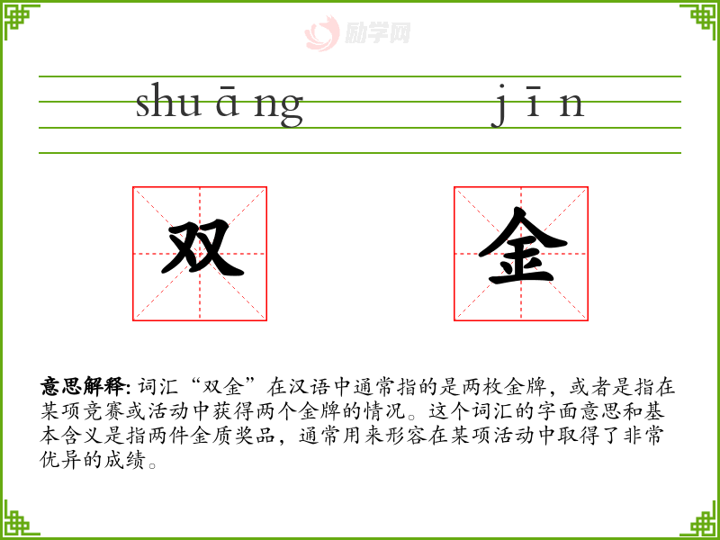 词汇“双金”在汉语中通常指的是两枚金牌,或者是指在某项竞赛或活动中获得两个金牌的情况。这个词汇的字面意思和基本含义是指两件金质奖品,通常用来形容在某项活动中取得了非常优异的成绩。