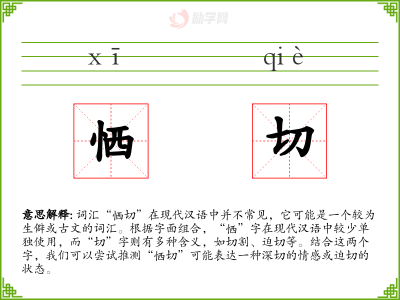 词汇“恓切”在现代汉语中并不常见,它可能是一个较为生僻或古文的词汇。根据字面组合,“恓”字在现代汉语中较少单独使用,而“切”字则有多种含义,如切割、迫切等。结合这两个字,我们可以尝试推测“恓切”可能表达一种深切的情感或迫切的状态。