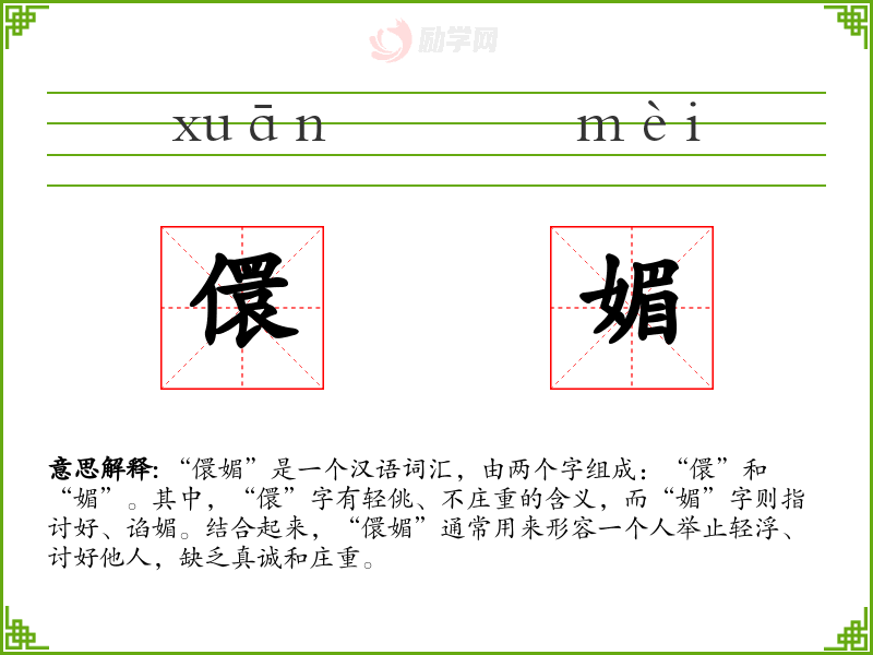 “儇媚”是一个汉语词汇,由两个字组成:“儇”和“媚”。其中,“儇”字有轻佻、不庄重的含义,而“媚”字则指讨好、谄媚。结合起来,“儇媚”通常用来形容一个人举止轻浮、讨好他人,缺乏真诚和庄重。