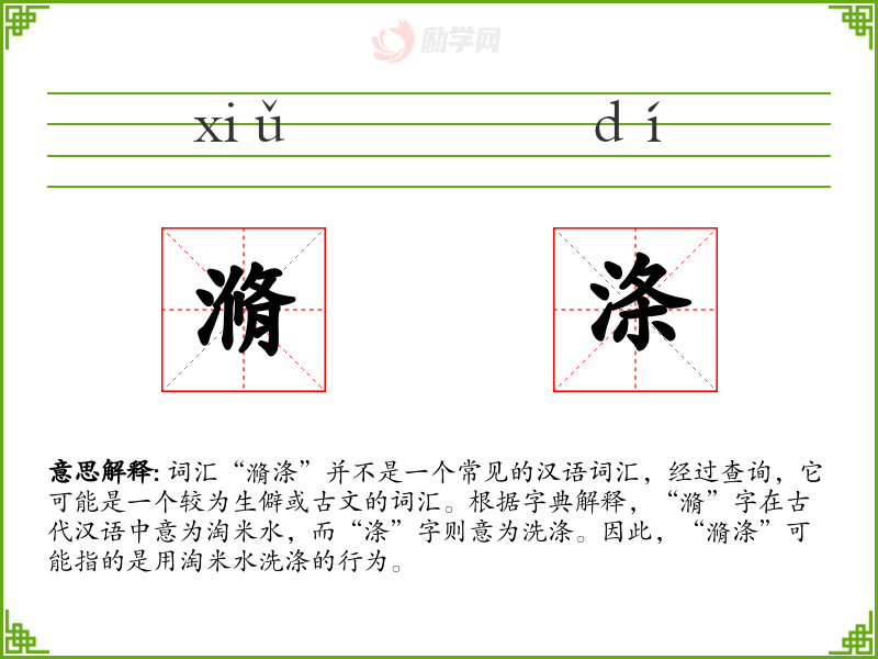 词汇“滫涤”并不是一个常见的汉语词汇,经过查询,它可能是一个较为生僻或古文的词汇。根据字典解释,“滫”字在古代汉语中意为淘米水,而“涤”字则意为洗涤。因此,“滫涤”可能指的是用淘米水洗涤的行为。