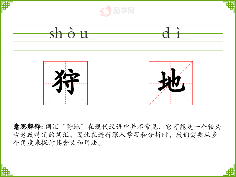 词汇“狩地”在现代汉语中并不常见,它可能是一个较为古老或特定的词汇,因此在进行深入学*和分析时,我们需要从多个角度来探讨其含义和用法。