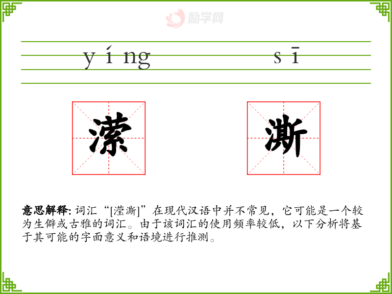 词汇“[滢澌]”在现代汉语中并不常见,它可能是一个较为生僻或古雅的词汇。由于该词汇的使用频率较低,以下分析将基于其可能的字面意义和语境进行推测。