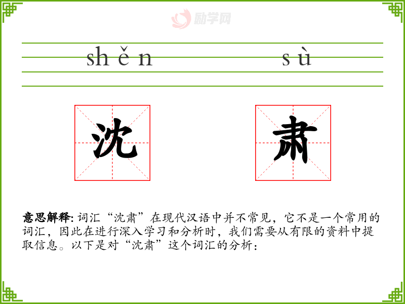 由于“沈肃”不是一个常用词汇,它在文学作品中可能出现,用以形容一种深沉而严肃的氛围或人物性格。在口语中,这个词汇可能不太常用,但在某些正式或文学性较强的语境中可能会出现。