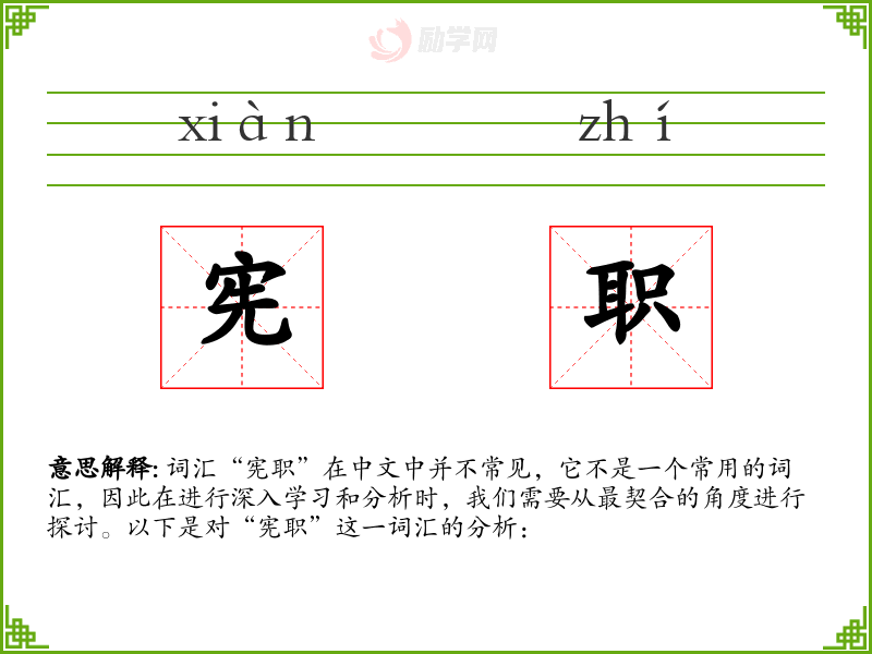 在专业领域,特别是在法律和政治学中,“宪职”可能指与宪法执行和维护相关的职责或职位,如宪法法院法官、宪法监督机构成员等。在文学和口语中,这一词汇可能不太常见,除非在讨论特定政治或法律议题时。