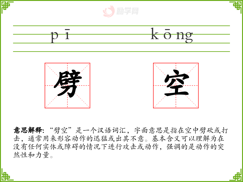 “劈空”是一个汉语词汇,字面意思是指在空中劈砍或打击,通常用来形容动作的迅猛或出其不意。基本含义可以理解为在没有任何实体或障碍的情况下进行攻击或动作,强调的是动作的突然性和力量。