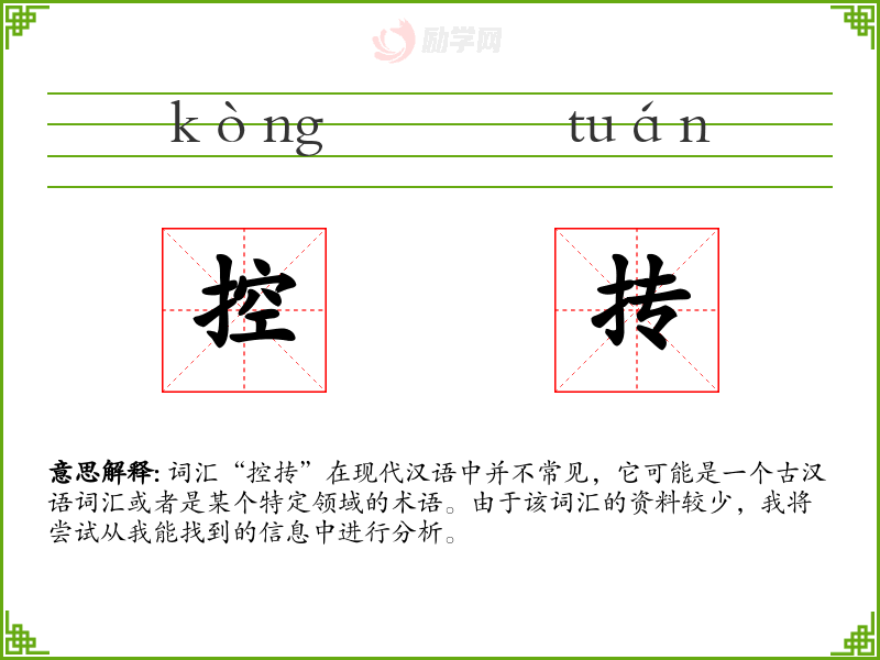 词汇“控抟”在现代汉语中并不常见,它可能是一个古汉语词汇或者是某个特定领域的术语。由于该词汇的资料较少,我将尝试从我能找到的信息中进行分析。