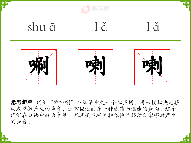 词汇“唰喇喇”在汉语中是一个拟声词,用来模拟快速移动或摩擦产生的声音,通常描述的是一种连续而迅速的声响。这个词汇在口语中较为常见,尤其是在描述物体快速移动或摩擦时产生的声音。