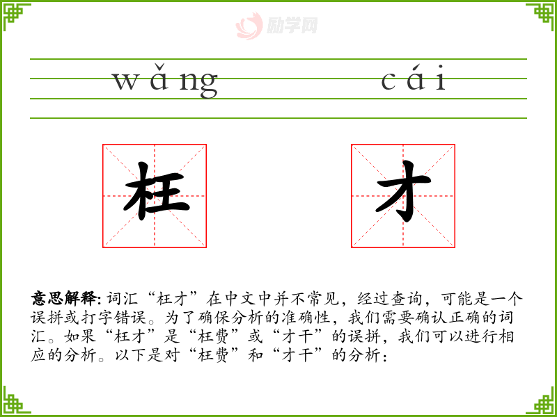 词汇“枉才”在中文中并不常见,经过查询,可能是一个误拼或打字错误。为了确保分析的准确性,我们需要确认正确的词汇。如果“枉才”是“枉费”或“才干”的误拼,我们可以进行相应的分析。以下是对“枉费”和“才干”的分析: