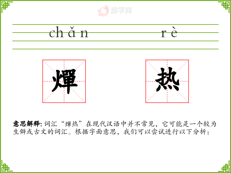 词汇“燀热”在现代汉语中并不常见,它可能是一个较为生僻或古文的词汇。根据字面意思,我们可以尝试进行以下分析: