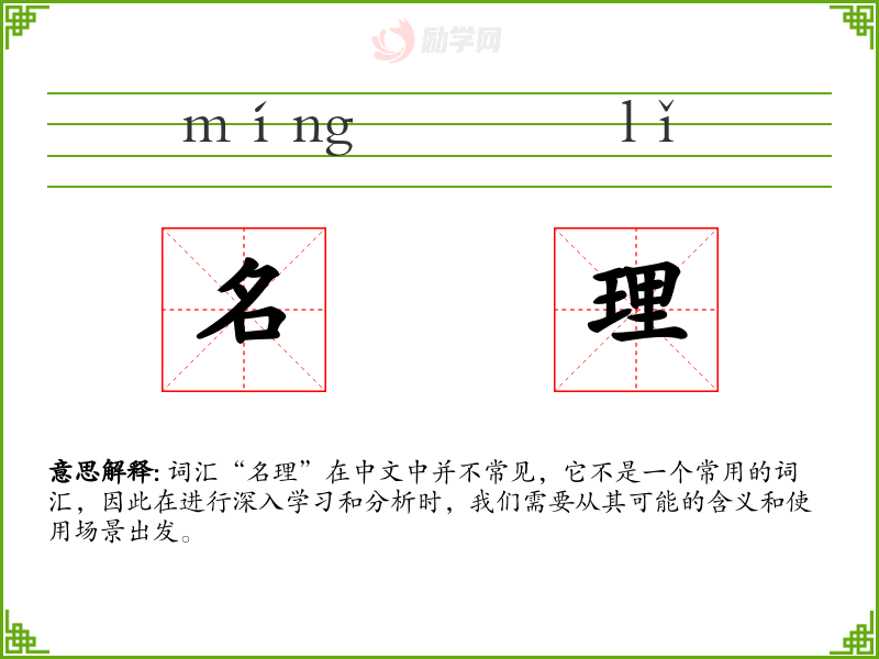 - 反义词:无(由于“名理”不是一个常用词汇,其反义词难以确定)