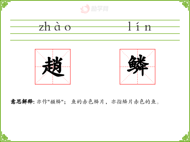 趙鳞的意思是:亦作"頳鳞"; 鱼的赤色鳞片,亦指鳞片赤色的鱼。