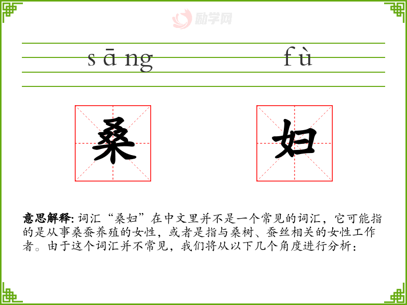 词汇“桑妇”在中文里并不是一个常见的词汇,它可能指的是从事桑蚕养殖的女性,或者是指与桑树、蚕丝相关的女性工作者。由于这个词汇并不常见,我们将从以下几个角度进行分析: