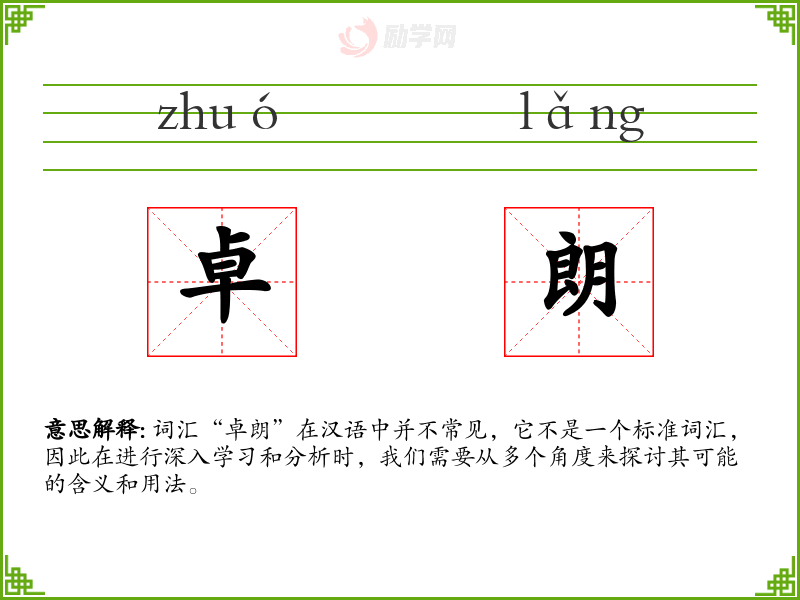 词汇“卓朗”在汉语中并不常见,它不是一个标准词汇,因此在进行深入学习和分析时,我们需要从多个角度来探讨其可能的含义和用法。