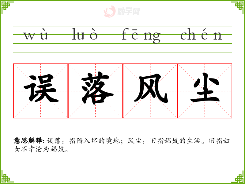误落风尘的意思是:误落:指陷入坏的境地;风尘:旧指娼妓的生活。旧指妇女不幸沦为娼妓。