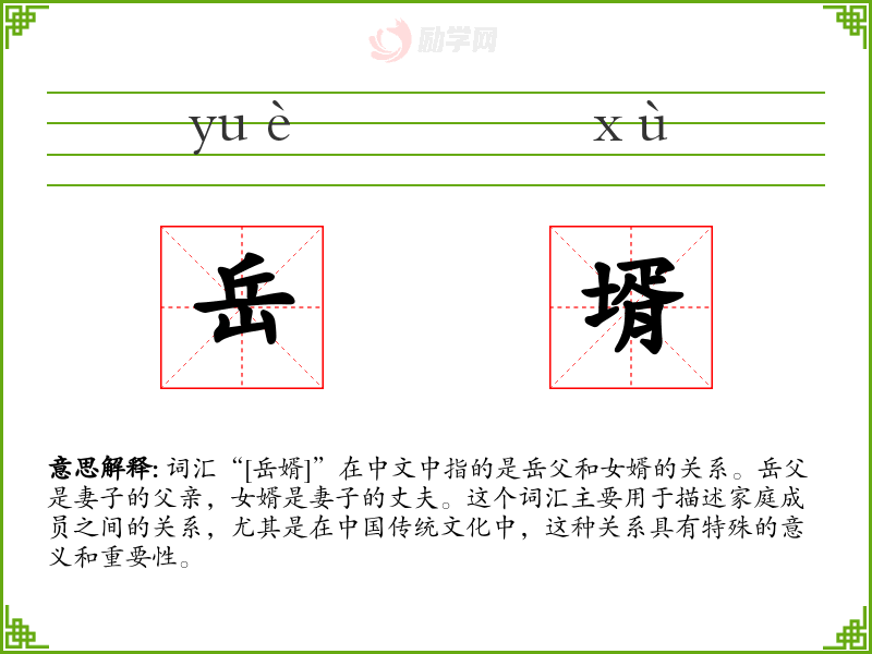 词汇“[岳婿]”在中文中指的是岳父和女婿的关系。岳父是妻子的父亲,女婿是妻子的丈夫。这个词汇主要用于描述家庭成员之间的关系,尤其是在**传统文化中,这种关系具有特殊的意义和重要性。