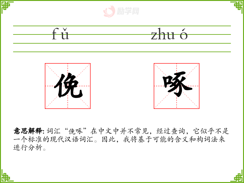 词汇“俛啄”在中文中并不常见,经过查询,它似乎不是一个标准的现代汉语词汇。因此,我将基于可能的含义和构词法来进行分析。