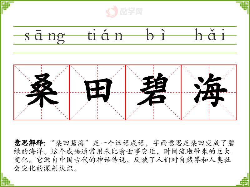 “桑田碧海”这个成语不仅是一个美丽的比喻,也是一个深刻的哲学思考。它提醒我们时间的宝贵和变化的无常,帮助我们在语言学和表达中更好地理解和传达这些复杂的概念。通过学和使用这个成语,我更加珍惜时间,也更加深刻地理解了语言的力量。