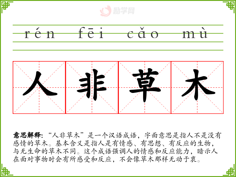 “人非草木”是一个汉语成语,字面意思是指人不是没有感情的草木。基本含义是指人是有情感、有思想、有反应的生物,与无生命的草木不同。这个成语强调人的情感和反应能力,暗示人在面对事物时会有所感受和反应,不会像草木那样无动于衷。