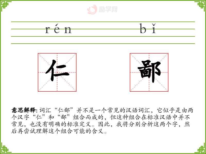词汇“仁鄙”并不是一个常见的汉语词汇,它似乎是由两个汉字“仁”和“鄙”组合而成的,但这种组合在标准汉语中并不常见,也没有明确的标准定义。因此,我将分别分析这两个字,然后再尝试理解这个组合可能的含义。