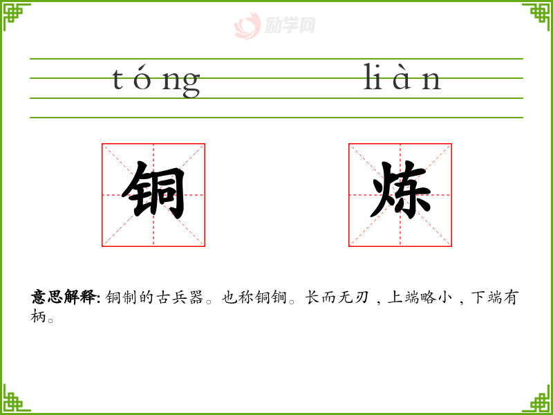 铜炼的意思是:铜制的古兵器。也称铜锏。长而无刃﹐上端略小﹐下端有柄。