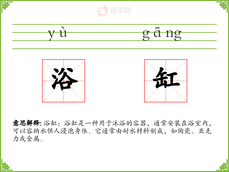 浴缸的意思是:新式的大澡盆。通常是陶瓷或搪瓷的,现在也有用塑料制的。