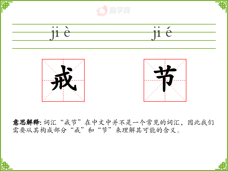 词汇“戒节”在中文中并不是一个常见的词汇,因此我们需要从其构成部分“戒”和“节”来理解其可能的含义。