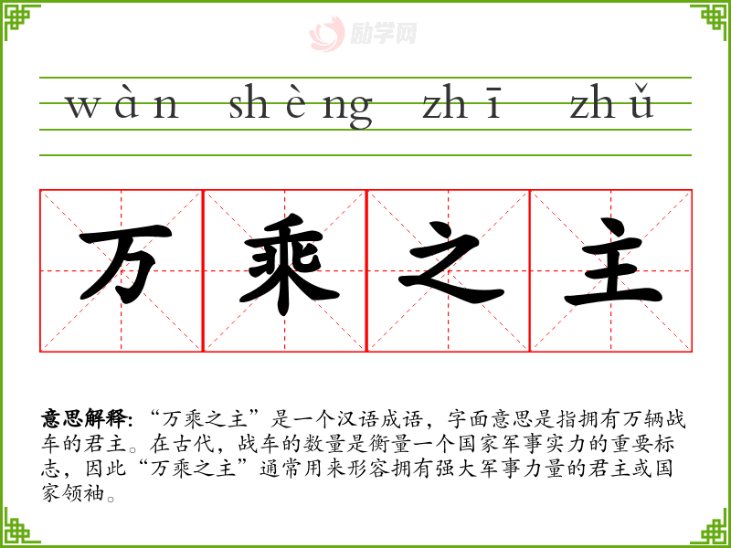 “万乘之主”是一个汉语成语,字面意思是指拥有万辆战车的君主。在古代,战车的数量是衡量一个国家军事实力的重要标志,因此“万乘之主”通常用来形容拥有强大军事力量的君主或国家领袖。