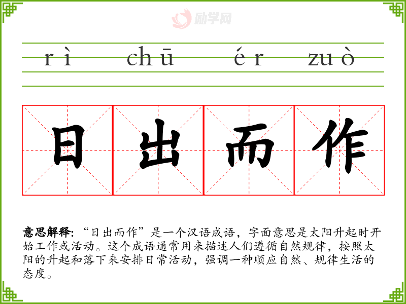“日出而作”是一个汉语成语,字面意思是太阳升起时开始工作或活动。这个成语通常用来描述人们遵循自然规律,按照太阳的升起和落下来安排日常活动,强调一种顺应自然、规律生活的态度。