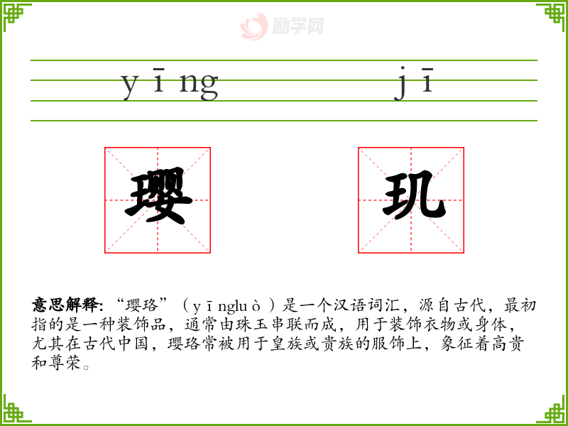 “璎珞”(yīngluò)是一个汉语词汇,源自古代,最初指的是一种装饰品,通常由珠玉串联而成,用于装饰衣物或身体,尤其在古代**,璎珞常被用于皇族或贵族的服饰上,象征着高贵和尊荣。