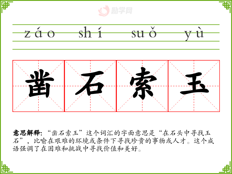 “凿石索玉”这个词汇的字面意思是“在石头中寻找玉石”,比喻在艰难的环境或条件下寻找珍贵的事物或人才。这个成语强调了在困难和挑战中寻找价值和美好。