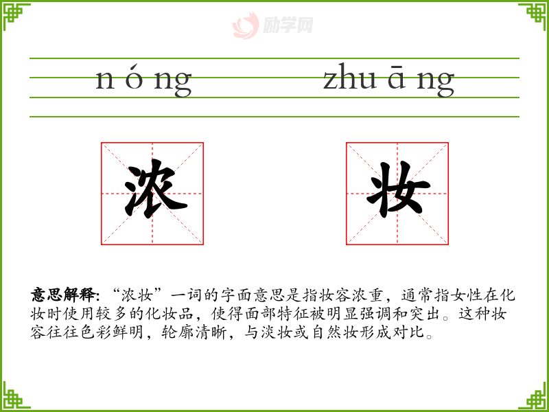 “浓妆”一词的字面意思是指妆容浓重,通常指女性在化妆时使用较多的化妆品,使得面部特征被明显强调和突出。这种妆容往往色彩鲜明,轮廓清晰,与淡妆或自然妆形成对比。