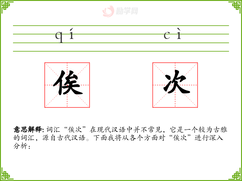 词汇“俟次”在现代汉语中并不常见,它是一个较为古雅的词汇,源自古代汉语。下面我将从各个方面对“俟次”进行深入分析: