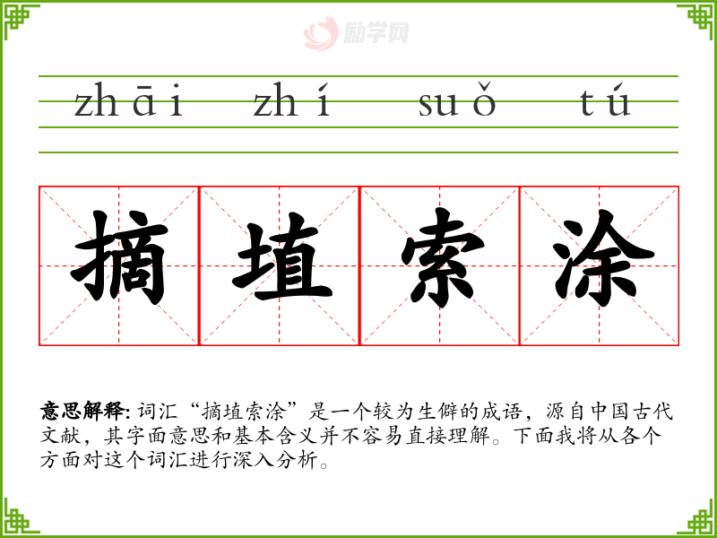词汇“摘埴索涂”是一个较为生僻的成语,源自**古代文献,其字面意思和基本含义并不容易直接理解。下面我将从各个方面对这个词汇进行深入分析。