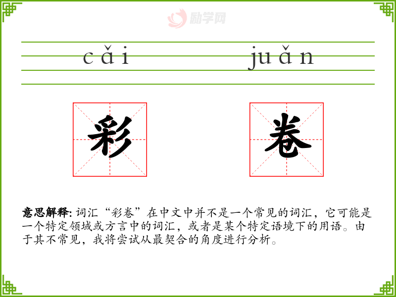 词汇“彩卷”在中文中并不是一个常见的词汇,它可能是一个特定领域或方言中的词汇,或者是某个特定语境下的用语。由于其不常见,我将尝试从最契合的角度进行分析。