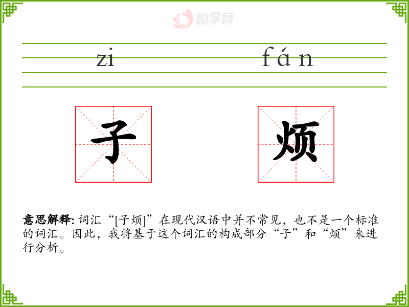 词汇“[子烦]”在现代汉语中并不常见,也不是一个标准的词汇。因此,我将基于这个词汇的构成部分“子”和“烦”来进行分析。