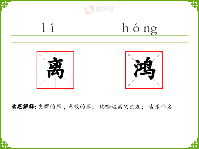 离鸿的意思是:失群的雁﹐离散的雁; 比喻远离的亲友; 古乐曲名。