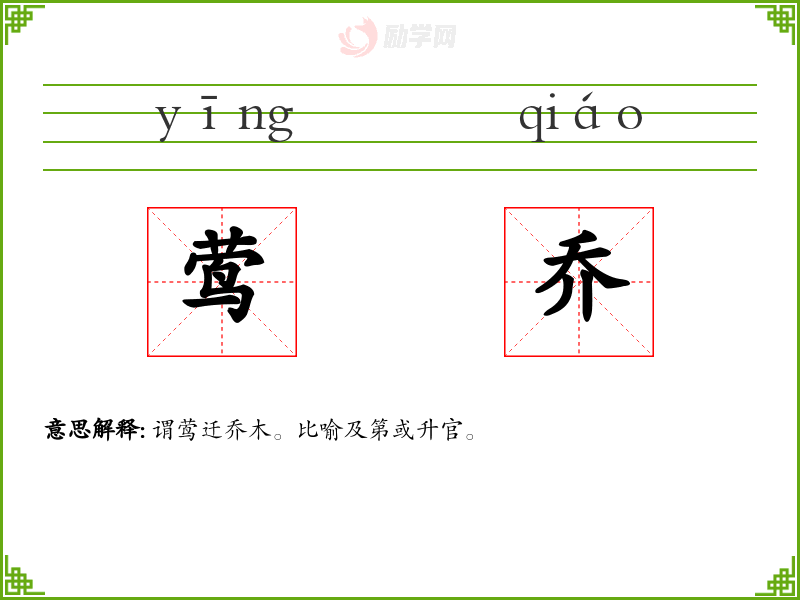 莺乔的意思是:谓莺迁乔木。比喻及第或升官。