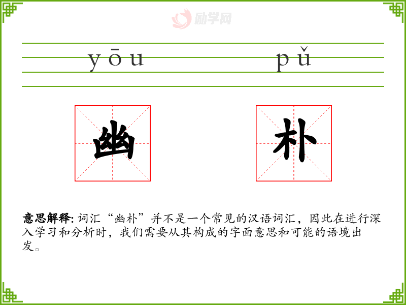 词汇“幽朴”并不是一个常见的汉语词汇,因此在进行深入学习和分析时,我们需要从其构成的字面意思和可能的语境出发。