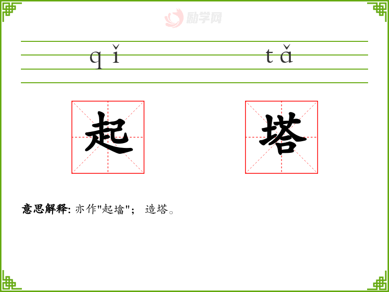 同本义。晋、宋译经时始造“塔”字。塔为形高而顶尖的佛教建筑物,多为五层七级,也有高至十三级的,初为藏佛骨(舍利子)的地方,后世也藏经于其中,俗称宝塔。