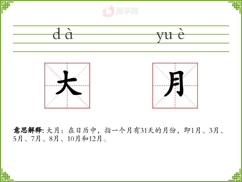 - 词源:大月一词直接来源于对月份天数的描述,没有复杂的词源历史。