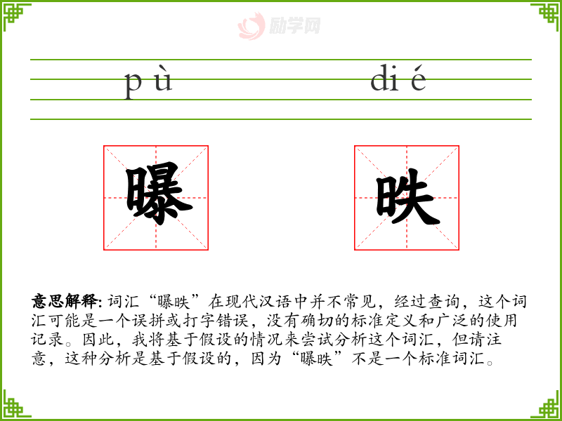 假设“曝昳”是一个由“曝”和“昳”两个字组成的词汇,我们可以分别解释这两个字的意思: