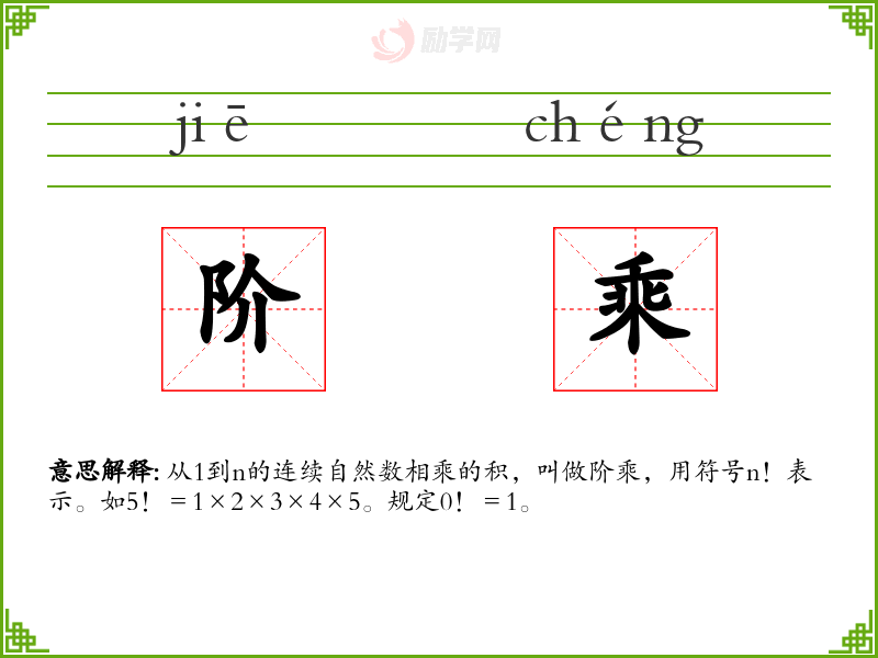 阶乘的意思是:从1到n的连续自然数相乘的积,叫做阶乘,用符号n!表示。如5!=1×2×3×4×5。规定0!=1。
