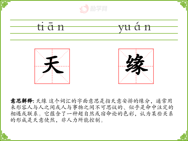 天缘 这个词汇的字面意思是指天意安排的缘分,通常用来形容人与人之间或人与事物之间不可思议的、似乎是命中注定的相遇或联系。它蕴含了一种超自然或宿命论的色彩,认为某些关系的形成是天意使然,非人力所能控制。