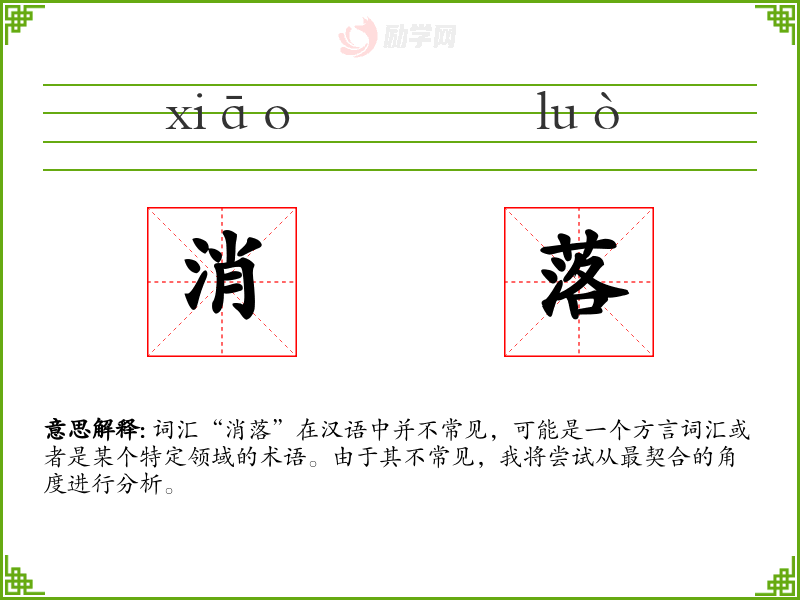 词汇“消落”在汉语中并不常见,可能是一个方言词汇或者是某个特定领域的术语。由于其不常见,我将尝试从最契合的角度进行分析。
