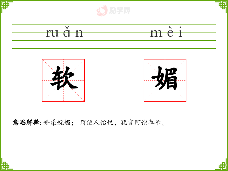 软媚的意思是:娇柔妩媚; 谓使人怡悦,犹言阿谀奉承。