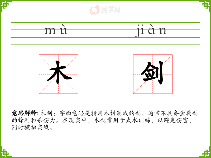 木剑:字面意思是指用木材制成的剑,通常不具备金属剑的锋利和杀伤力。在现实中,木剑常用于武术训练,以避免伤害,同时模拟实战。